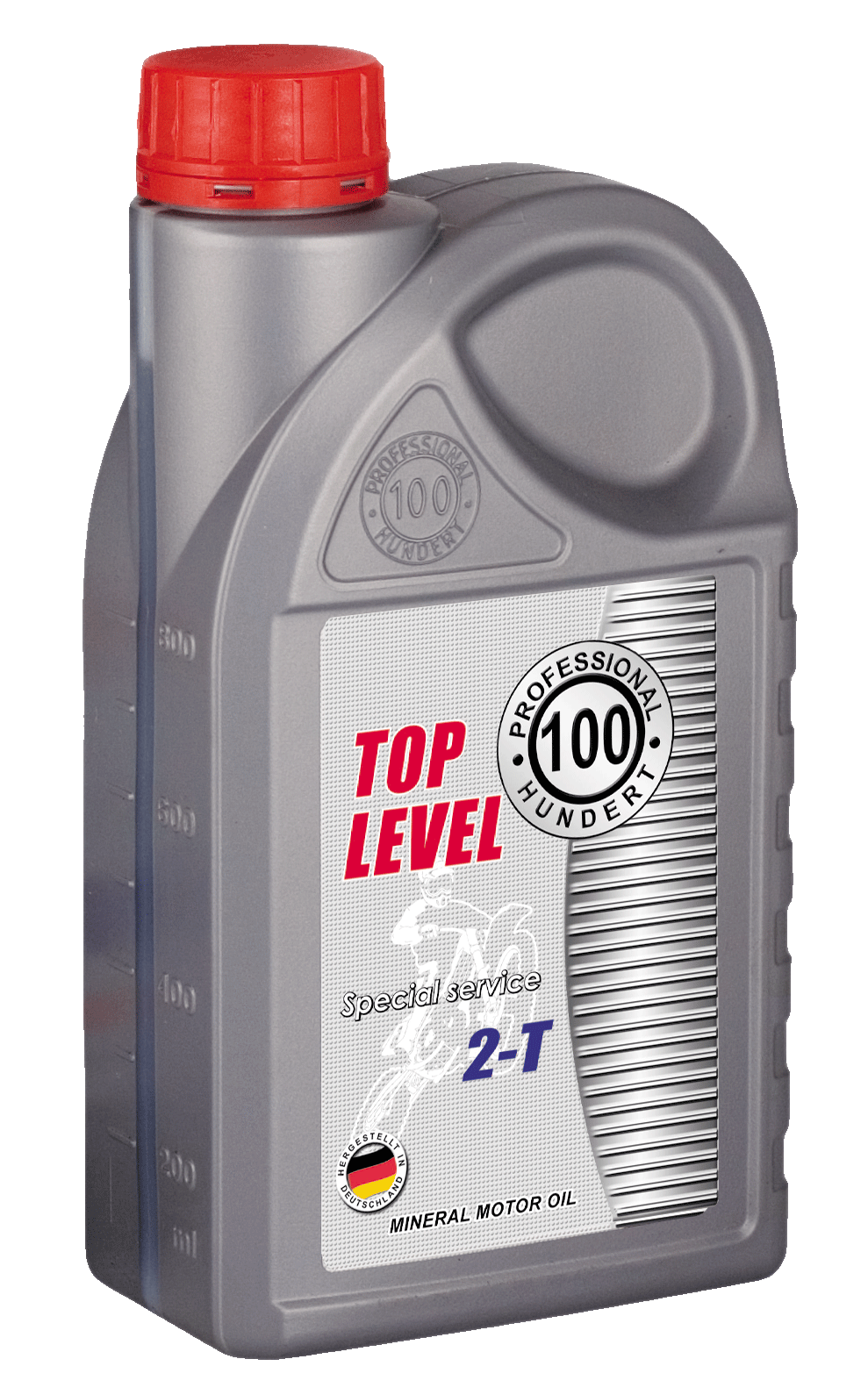 PROFESSIONAL HUNDERT® Top Level 2-T – ist ein selbstmischendes Zweitakt-Motorenöl. Die technischen Anforderungen, nämlich die Gewährleistung von Kolbensauberkeit und Korrosionsschutz sowie die Verhinderung von Ringstecken, Fressen und Glühzündungen, werden deutlich erfüllt. PROFESSIONAL HUNDERT® Top Level 2-T ist nach Herstellervorschrift für Mischungsverhältnisse bis zu 1:50 und für Getrenntschmierung (Autolube-Systeme) empfohlen. Dieses Zweitakt-Motorenöl für Hochleistungsmotoren ist mineralölbasisch. Hergestellt aus hochwertigem, entparaffiniertem Grundöl und modernsten Additiven.